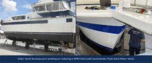 We’re thrilled to be working on a truly special project: the complete refit of a 1978 Chris Craft Commander Flush Deck Motor Yacht. The owner’s vision is to honor cherished memories and create a legacy boat for his family. Our team began with a full evaluation of every system, preserving the yacht’s classic style while upgrading key components. The Detroit Diesel 8V71 engines received a full overhaul, along with a new Centek Marine exhaust system. We then tackled the running gear with a new shaft, cutlass bearing, and hull repairs from a previous grounding. Moving topside, we modernized the AC, water heater, fire suppression, and electrical systems. With mechanical systems in top shape, the hull and bottom paint are complete, and we’re now focusing on the deck and superstructure. Inside, our carpenters are restoring leaky port windows and continuing the interior refit. This labor of love is nearing completion—stay tuned for more updates and photos!